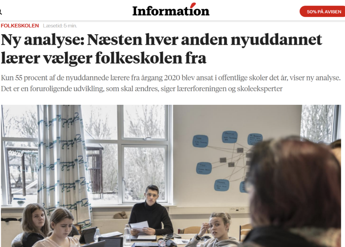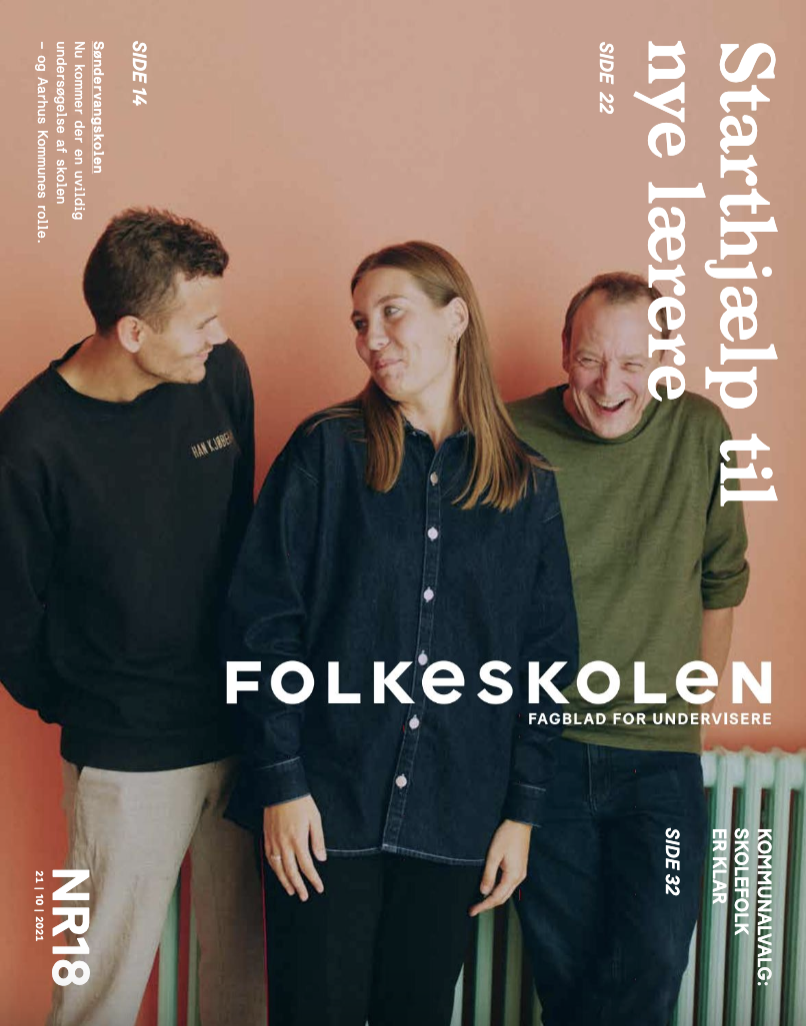 Forsiden på Folkeskolen nr. 18, 2021, som omhandler vores kursus. På forsiden er de tre første nye lærere, Thomas, Trine og Jan, som deltog i kurset. De har fået en god start i deres lærerprofession. Hele artiklen kan læses på folkeskolen.dk inde i bladarkivet.